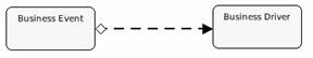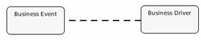 The table below provides some examples of how different Rel Symbol definitions are rendered in Archi Graphical Modeler. In all the examples, the Rel Symbol definition is used to link the "Business Event" node to the "Business Driver" node;